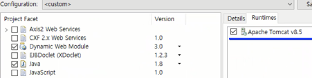 다이내믹 웹 모듈과 런타임즈의 톰캣 서버를 클릭해서 적용해준다