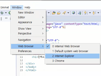 다른 웹브라우저로 열고 싶으면 window->web browser에서 원하는 인터넷 브라우저로 선택해주면 된다