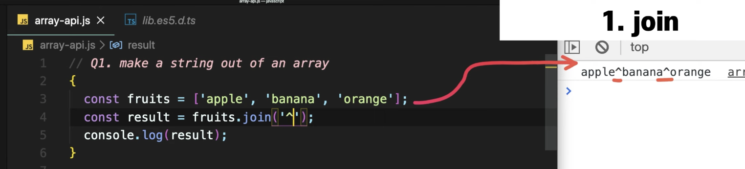 Join 배열에서 문자열로 변환 . join은 배열에 있는 함수를 문자열로 변환해준다 const result = fruits.join();에서 () 괄호 안에는 생략도 가능하고 구분자를 넣어주고 싶다면 ', ' '^' 등 구분자를 추가하는 것이 가능하다 Split 문자열에서 배열로 변환 위와 반대로 문자열을 배열로 변경하려면 .split을 사용한다. split엔 옵션으로 구분자와 나올 수 있는 개수를 제한하는 것이 가능한데, 만약 구분자를 넣지 않으면 옆의 과일 이모티콘이 하나 하나 구분되는 것이 아닌 전체가 한 개로 묶여서 split은 구분자를 꼭 넣는 것이 좋다. 또한 fruits.split(', ', '2')로 개수를 2로 첫 번째 두 개의 배열을 지정받아서 사과와 키위만 출력된다. Reverse ..